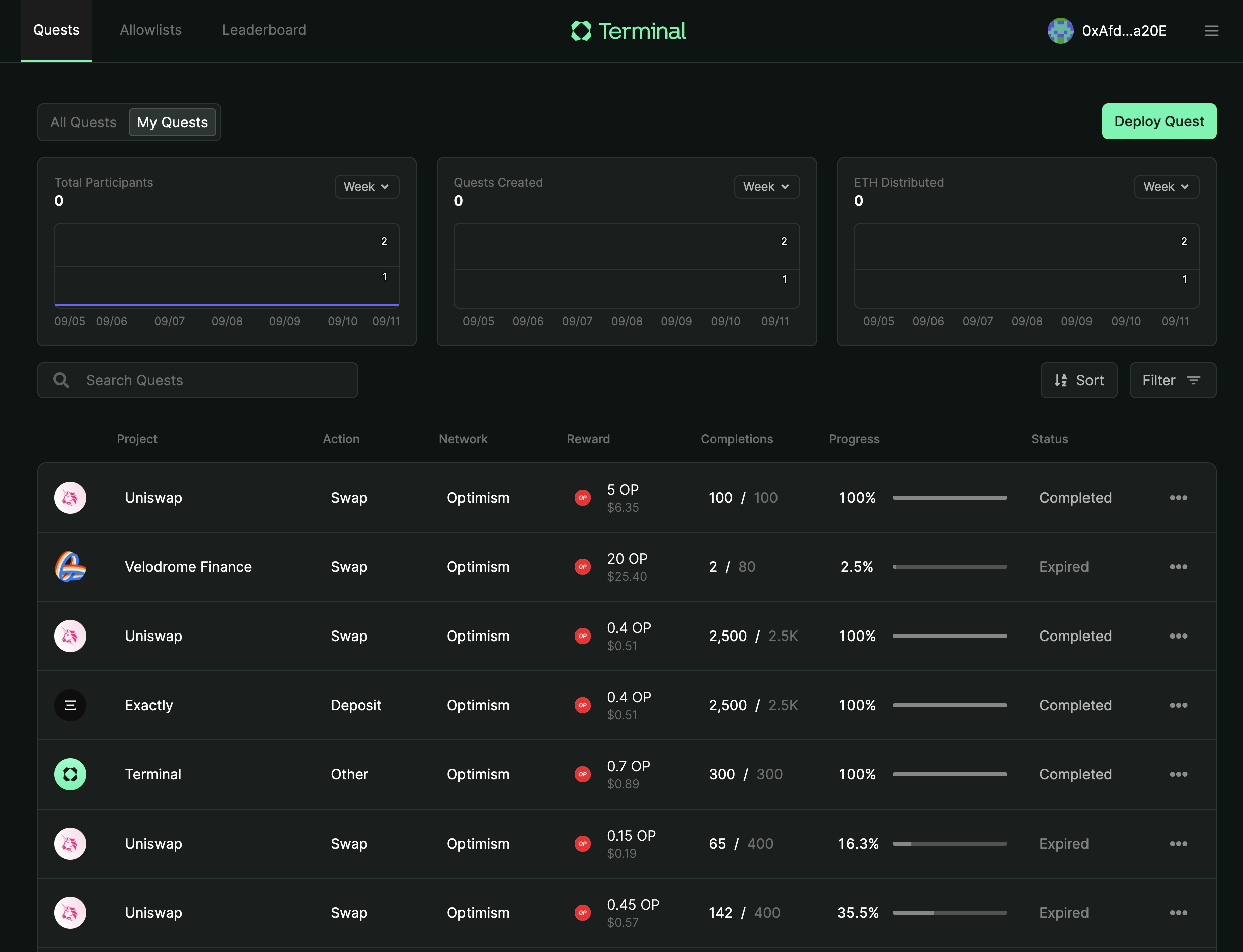 When the quest is deployed, you can track results by visiting the Quest Details page under "My Quests". While you will be able to start seeing quest completions immediately, you will need to wait an hour before seeing chart data. You can click into a given quest to and see more performance details such as hourly/daily breakdown of completions, and quest participant insights like things like top protocols used, wallet balances, and transaction history info.